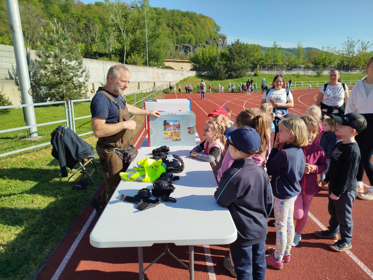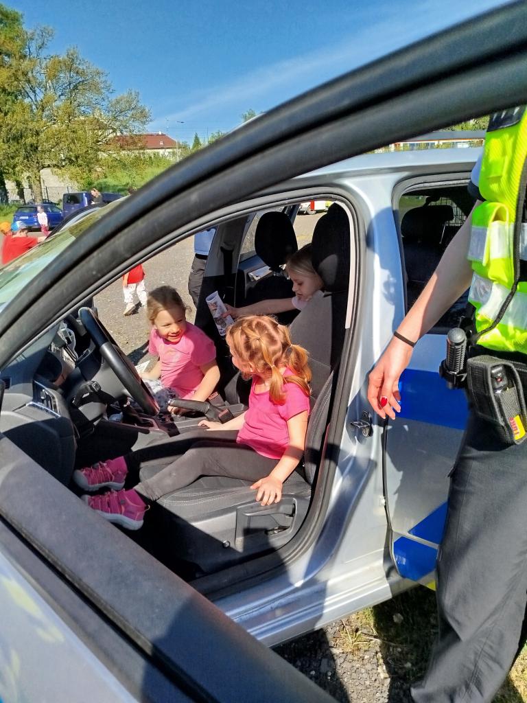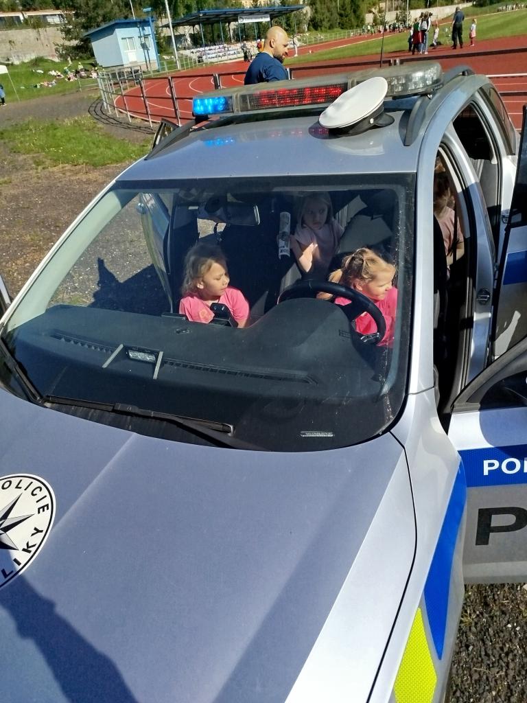 Dopravní den na atletickém stadionu. Soutěže, doprovodný program - hasiči,policie a záchranná služba. Děti si mohly prohlédnout vozy a jejich vybavení.