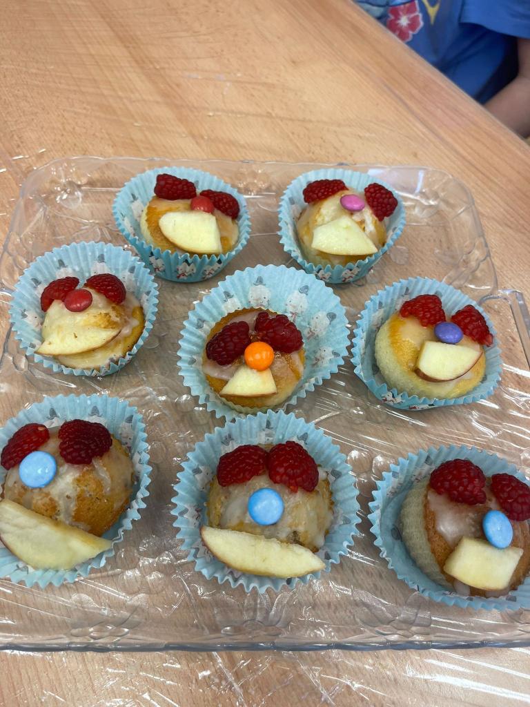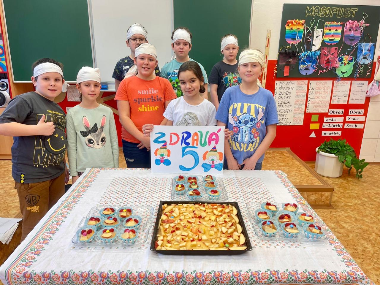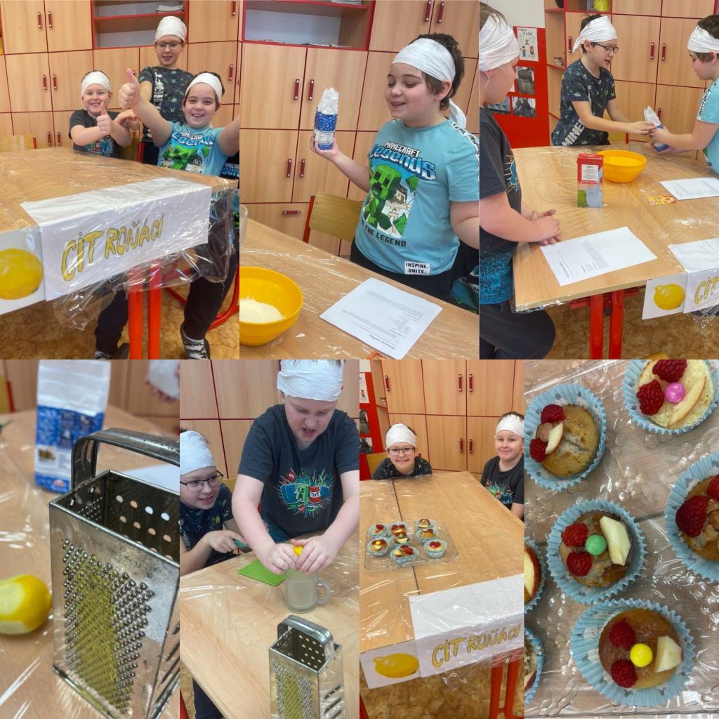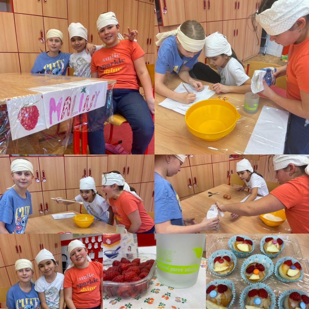 Tři týmy ze 3. a 4.třídy v akci “Zdravá pět” na téma Karneval. Mafínky 1.tým citrónové, 2.tým malinové a 3.tým jablíčkové. A společně pak nazdobené jako karnevalové masky 🙂 Každý tým si od základu vše dělal sám - název týmu, nastudování receptu, správné poměry surovin, postup a stejně tak i konečné zdobení včetně cukrové polevy. Všichni byli šikovní, tvůrčí a už se těší na to, až si společně i s prvňáčky a druháčky po úterním plavání dají.🙂 A kdyby prý bylo málo, zvládli společně k tomu upéct i celý plech koláče.